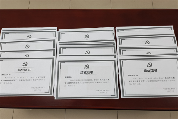 線下線上“落地生根”。公司黨總支向每名黨員發(fā)放《條例》《新舊紀(jì)律處分條例對(duì)比》等學(xué)習(xí)資料100余本,組織全體黨員采取新舊條例對(duì)照、新增內(nèi)容重點(diǎn)解讀等方式開展學(xué)習(xí),在公司上下掀起了學(xué)習(xí)熱潮。公司黨總支組織全體黨員參加河南黨員教育“云課堂”,6月14日—25日,組織黨員在河南黨員教育信息化平臺(tái)上參加全省黨員黨紀(jì)學(xué)習(xí)教育專題網(wǎng)絡(luò)培訓(xùn)班,開展線上學(xué)習(xí)活動(dòng)。通過參加專題網(wǎng)絡(luò)培訓(xùn),廣大黨員自覺認(rèn)真學(xué)習(xí)修訂后的《條例》,做到學(xué)紀(jì)、知紀(jì)、明紀(jì)、守紀(jì),把遵規(guī)守紀(jì)刻印在心,進(jìn)一步強(qiáng)化紀(jì)律意識(shí)、加強(qiáng)自我約束、提高免疫能力,不斷增強(qiáng)政治定力、紀(jì)律定力、道德定力、抵腐定力,始終做到忠誠干凈擔(dān)當(dāng)。全體黨員都拿到了“結(jié)業(yè)證書”。